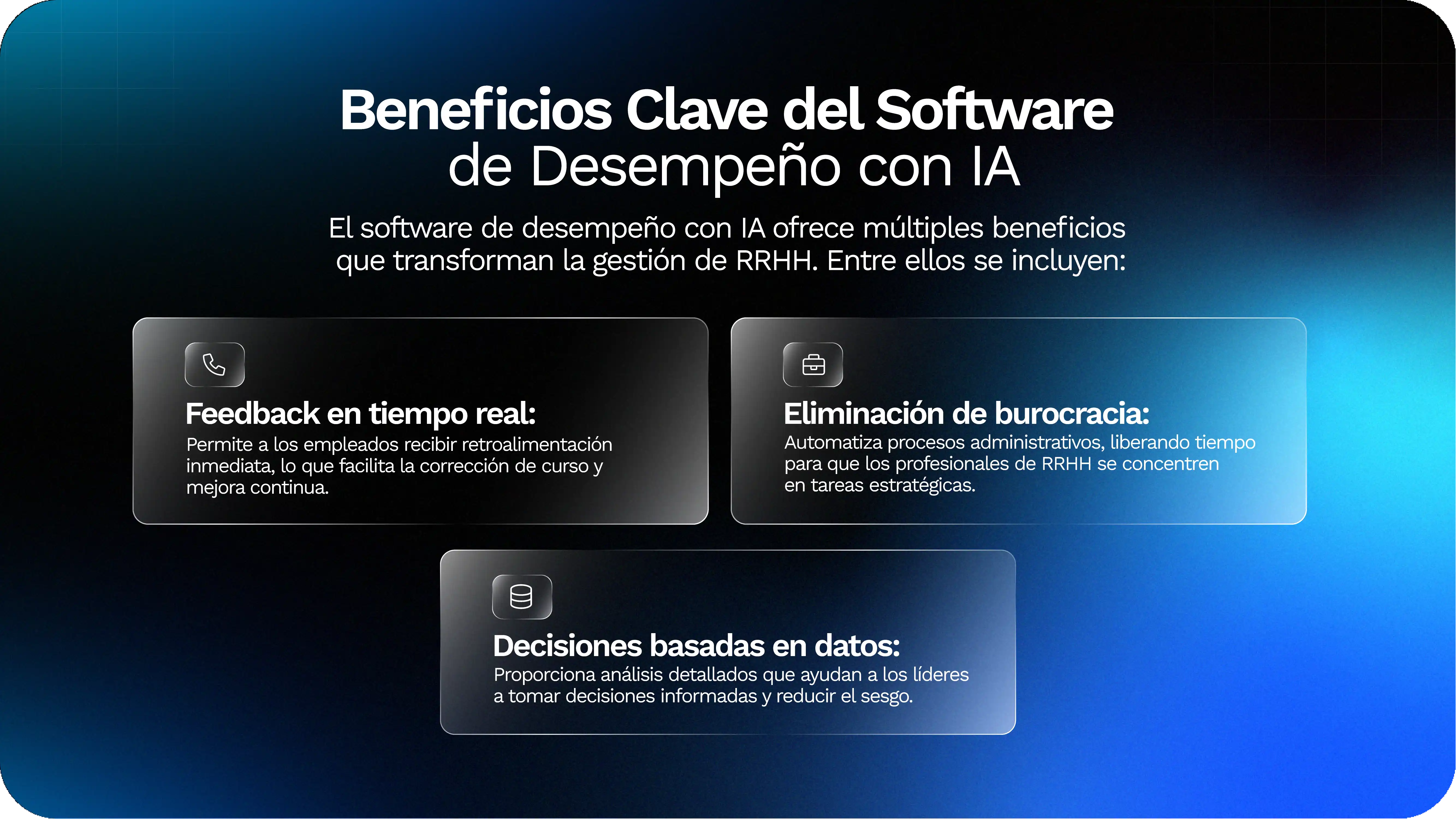 El software de desempeño con IA ofrece múltiples beneficios que transforman la gestión de RRHH. Entre ellos se incluyen: